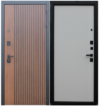 Внешняя отделка Наружный лист металла 1,5 мм. Экошпонированная дизайнерская панель МДФ 10 мм. с линейной фрезеровкой в цветовой комбинации: "Дуб кантри темный", черное патинирование по фрезеровке. Наличник гладкий МДФ 80 мм., цвет "Черный кварц".