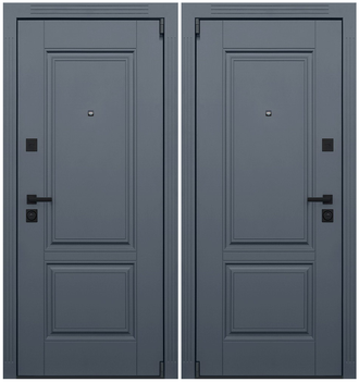 Внешняя отделка Лист металла 2 мм. Панель МДФ 16 мм. Объемная фрезеровка. Цвет "графит". Наличник МДФ: толщина 16 мм, ширина 85 мм.