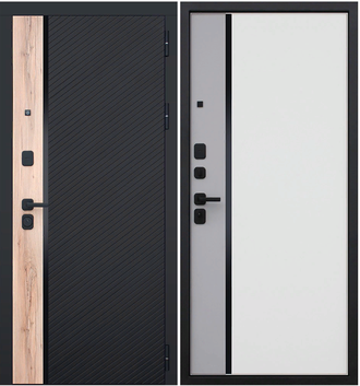 Внешняя отделка Наружный лист металла 1,5 мм. Панель МДФ 10 мм. Объемная фрезеровка. Цветовая комбинация: “дуб галиф натур”, “шагрень черная”. Декоративная пластиковая вставка, цвет "черный". Наличник МДФ 80 мм., цвет “черный кварц”.
