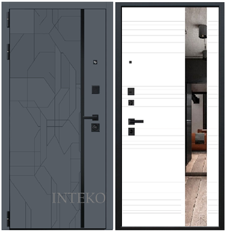 Внешняя сторона: Лист металла 1.8 мм. + МДФ 10мм. Цвет "Графит" Вертикальная вставка из черного глянцевого лакобеля.