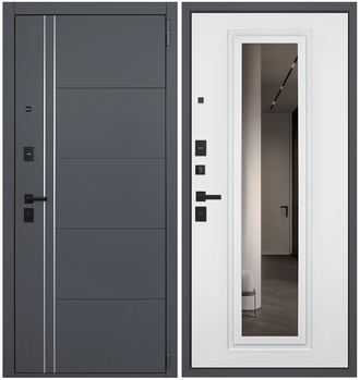 Внешняя отделка Лист металла 1 мм. Экошпонированная панель МДФ 10 мм (цвет "бетон темный"). Объемная фрезеровка. Вставки из вертикальных молдингов 2 шт (цвет "матовый хром"). Наличник МДФ гладкий 70 мм.